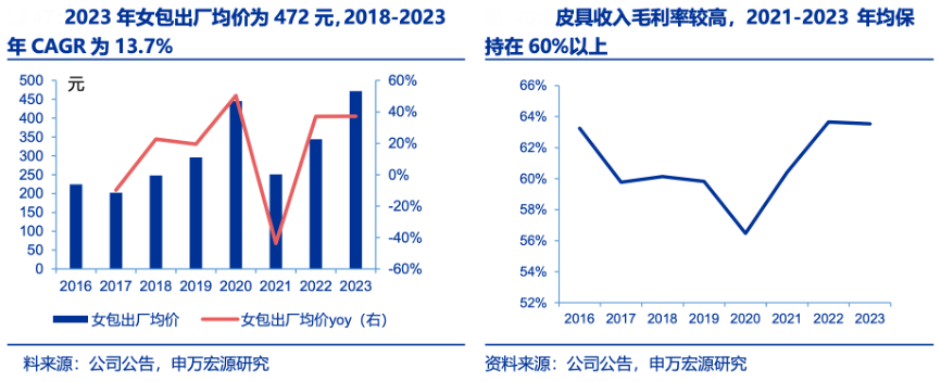 經典案例:根據公司公告、申萬宏源研究等綜合資訊表明,菲安妮2022年將國潮設計融入包袋產品,深耕“巧錦開物”系列,利用獨家創新織錦工藝推出“煙粉瑤池”“蒼月瑤池”“菱標”等新品。通過新品系列,推進品牌煥新 升級、有效提升客單價。2023 年女包出廠均價為 472 元,皮具收入毛利率較高,2021-2023 年均保持在 60%以上。