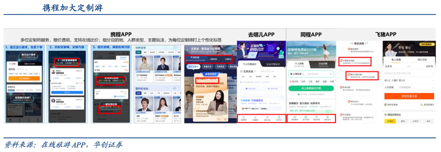經典案例:根據在線旅游APP、華創證券等綜合資訊表明,2023年攜程私家團 GMV 同比 2019 年增長 370%,其中 2~9 人的小團 GMV 同比 2019 年增長 100%。相比較下,攜程定制游產品相較其他平臺更為個性化和人性化,依 托完整的大交通和大住宿的旅游生態圈,定制產品有更為明顯的優勢。