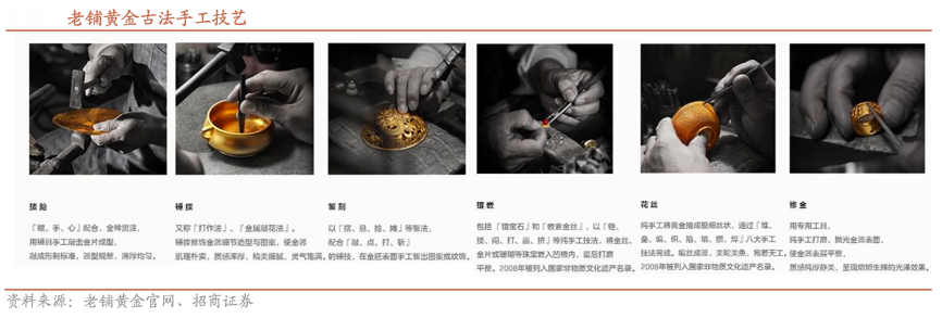 經(jīng)典案例:根據(jù)老鋪黃金官網(wǎng)、招商證券等綜合資訊表明,老鋪黃金定位“手工古法金器”,堅持鉆研各類古法工藝,通過古法鑄型(失蠟法、手工摟胎)、手工細(xì)金(錘揲、花絲、鏨刻、鑲嵌、鏤空、炸珠、燒藍(lán))、手工修金等工藝手法,使得產(chǎn)品兼具現(xiàn)代審美與傳統(tǒng)文化,自然賦予品牌歷史厚重感。