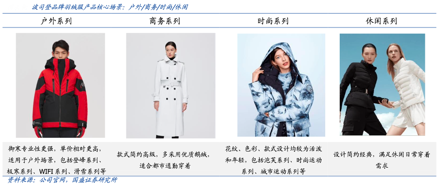 經(jīng)典案例:根據(jù)公司官網(wǎng)、國盛證券研究所等綜合資訊表明,作為羽絨服品類龍頭品牌,波司登公司主品牌圍繞不同的穿著場景(商務(wù)、戶外、時(shí)尚、休閑)、不同人群需求特征,持續(xù)迭代推出豐富的產(chǎn)品,包括戶外場景下的極寒系列、滑雪系列,時(shí)尚場景下的泡芙系列、時(shí)尚運(yùn)動(dòng)系列,商務(wù)場景下的風(fēng)衣羽絨服系列等。