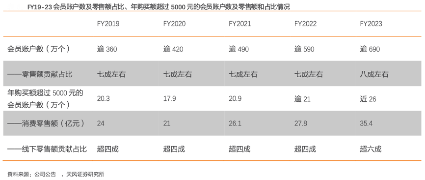 經典案例:根據公司公告、天風證券研究所等綜合資訊表明,江南布衣精心設計的會員制度提升了消費者體驗,為品牌提供深入的市場洞察,指導產品迭代,促進社群建設,更好傳達品牌價值觀。FY19-23,公司會員賬戶數由逾 360 萬個 增長到逾 690 萬個,零售額貢獻占比增長至八成左右;年購買額超過 5000 元的會員賬戶 數由 20.3 萬個增長到近 26 萬個。