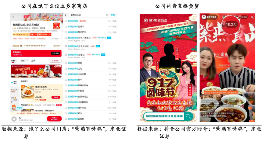 經典案例:根據餓了么公司門店:“紫燕百味雞”、抖音公司官方帳號:“紫燕百味雞”、東北證券等綜合資訊表明,紫燕食品公司積極開辟外賣平臺、O2O 平臺的線上渠道。隨著外賣的普及化,公司也與美團、 餓了么等外賣平臺達成合作,在平臺上開設線上門店,讓顧客無時無刻都能享有新鮮紫燕鹵制品。