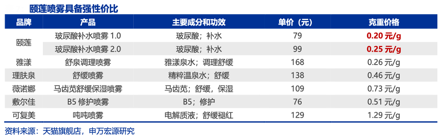 經典案例:根據天貓旗艦店、申萬宏源研究等綜合資訊表明,頤蓮品牌創建于 2003 年,專注“玻尿酸護膚”二十載,產品價格親民實惠,其中頤蓮玻尿酸補水噴霧以 0.20 元/g 的超高性價比,長效保濕、方便攜帶、使用場景廣泛、包裝鎖鮮等優勢,天貓總銷量超過 5000 萬瓶,帶動其他產品順利出圈,玻尿酸精華面膜、玻尿酸分體面膜在天貓總銷量均突破 50 萬件。