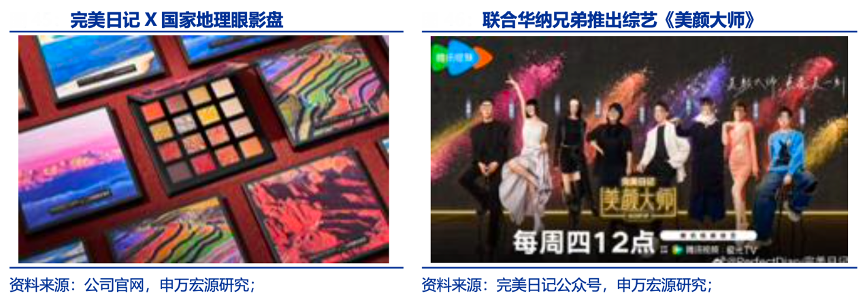 經典案例:根據公司官網、完美日記公眾號、申萬宏源研究等綜合資訊表明,完美日記明星代言人覆蓋多圈層粉絲,現象級綜藝吸引流量。2023 年 7 月, 完美日記攜手華納兄弟探索打造的國家化專業化妝競賽類綜藝《美顏大師》開播,節目從成千上萬名化妝愛好者選出了 8 位專業化妝師選手同臺競技,在為觀眾解決化妝難題的同時宣傳自家產品以及品牌理念,提升品牌知名度,擴大潛在用戶規模。