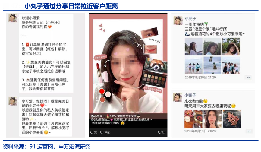 經典案例:根據91運營網、申萬宏源研究等綜合資訊表明,完美日記通過用戶購買產品后獲得的紅包以及新用戶掃碼免費送美妝工具等途徑來獲得用戶微信號,邀請用戶進入微信群,并且以“小完子”美妝顧問形象添加好友。“小完子”區別于傳統客服,除去常規工作,還以 1 條/天的頻率發布朋友圈或視頻號,宣傳新品同時也分享生活日常,拉近與年輕客戶群體的距離。