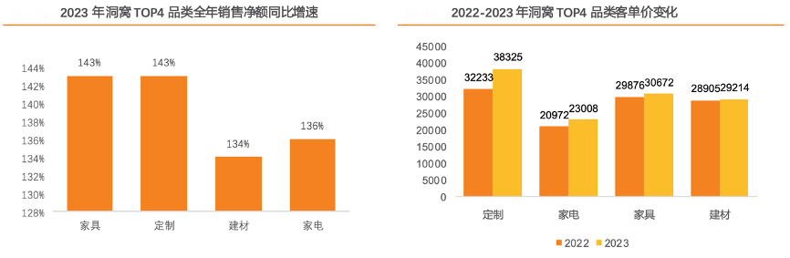 經典案例:根據公司年報、天風證券研究所等綜合資訊表明, 2022-2023 年洞窩整體銷售凈額從 346 億元提升至 974 億元,主要得益于洞窩廣泛滲透以及用戶規模和商品豐富度快速提升。拆分量價來看,2022-2023 年洞窩客單價從 3.7 萬元提升至 4.1 萬元、客單量從 2.4 單提升 至 2.6 單,均增長約 10%,主要系憑借線上線下相結合的新購物場景帶來了服務體驗升級。