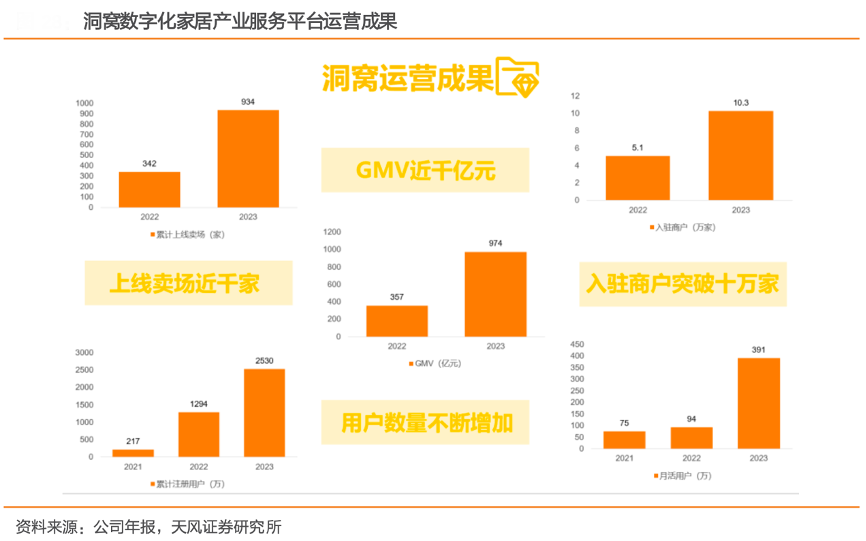經典案例:根據居然之家洞窩數據、艾瑞咨詢、公眾號家居新范式、天風證券研究所等綜合資訊表明,洞窩成立于2020 年12月,依托居然之家的產業背景 和平臺資源打造 ,通過聚焦產 業鏈上 下游的 數字化 賦能、線 上線下 一體化 全場景 零售、跨 境電商三大核心業務,全鏈路賦能品 牌工廠 、經銷 商和賣場。截至 2023 年底洞窩累計上線賣場已達 934 家,同比增長 173.1%;入駐商戶超過 10 萬家。