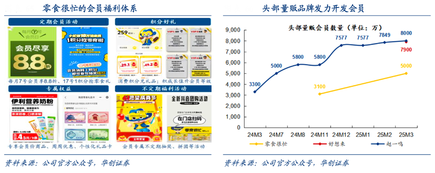 經典案例:根據公司官方公眾號、華創證券等綜合資訊表明,2023 年左右零食很忙、好想來均開拓會員體系,配套以各類會員活動及福利,開拓客群并強 化會員粘性,頭部企業會員數快速攀升,且鳴鳴很忙 1.2 億個、好想來 7900 萬個會員, 大幅領先中小品牌不足 2000 萬會員的水平。此外,量販品牌逐步開拓開辟直播、線上商 城/外賣、團購等業務,試水拓寬業務邊界。