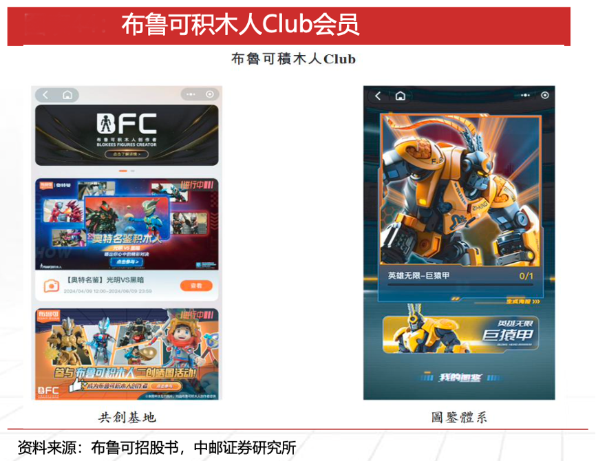 經典案例:根據布魯可招股書、中郵證券研究所等綜合資訊表明,布魯可公司設立多渠道會員計劃,包括微信小程序布魯可積木人Club和各大電商平臺旗艦店會員。通過布魯可積木人Club,公司為消費者提供多樣的互動體驗,其發布圖片和文字,分享他們的收藏和二次創作作品;截至2024H1,公司在布魯可積木人Club 上擁有約200萬注冊會員。