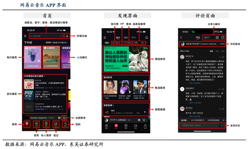 經典案例:根據網易云音樂APP、東吳證券研究所等綜合資訊表明,網易云音樂逐步成為用戶發現音樂的平臺、音樂流行的發源地。2024 年網易云音樂 APP 完成了產品界面的大幅調整,首頁推薦、播放界面、個人主頁、社區廣場等版塊得到重新設計,刪減冗余功能,提升用戶體驗。