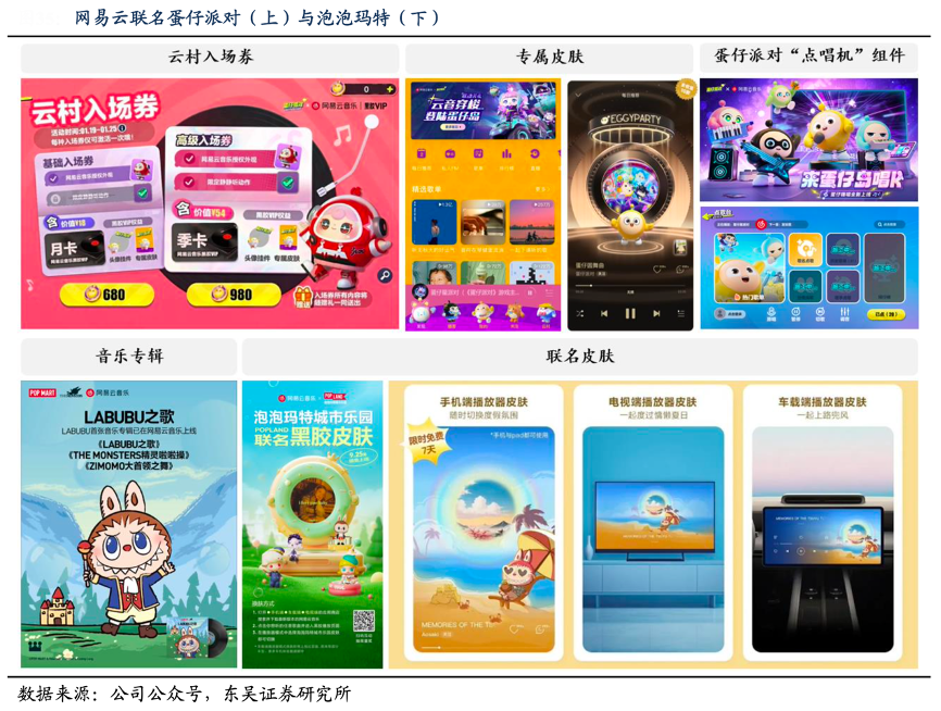 經典案例:根據公司公眾號、東吳證券研究所等綜合資訊表明,近年來網易云音樂公司不斷創新聯名方式,2023 年 9 月,網易云音樂推出泡泡瑪特城市樂園聯名黑膠皮膚,包括 MOLLY、LABUBU、SKULLPANDA、DIMOO 專屬播放器皮膚;2024 年 7 月,網易云音樂上線 LABUBU 首張音樂專輯,并推出 LABUBU 夏日主題聯名皮膚。