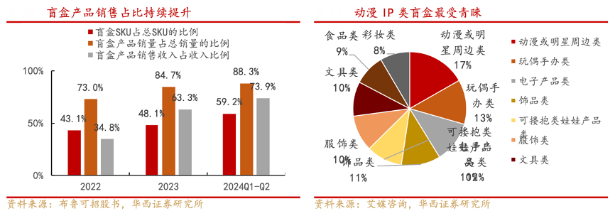 經(jīng)典案例:根據(jù)布魯可招股書、艾媒咨詢、華西證券研究所等綜合資訊表明,盲盒模式順應(yīng)情緒消費趨勢,成為快速增長的核心產(chǎn)品。盲盒產(chǎn)品在公司業(yè)務(wù) 中的占比持續(xù)攀升:2021年至2023年,盲盒的銷量從 0 增長至 3168 萬件,收入占比從0提升至63%,達 5.55 億元。