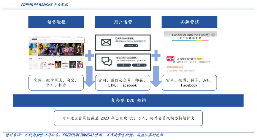 經典案例:根據萬代南夢宮公司公告、PREMIUM BANDAI官網、萬代南夢宮微博、國盛證券研究所等綜合資訊表明,PREMIUM BANDAI 已被確立為萬代集團旗下核心的官方電商平臺,其日本 地區會員數截至 2023 年已突破 555 萬人。該平臺采取預約制銷售機制,控制庫存風險,并配合數字化直達手段實現 IP 與用戶的深度綁定。