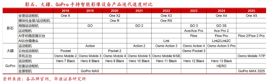經典案例:根據各品牌官網、華源證券研究所等綜合資訊表明,影石不僅在功能創新方面引領行業,產品線迭代速度同樣領先市場。影石年均推出 3-5 款核 心產品,23/24/25H1 分別更新 3/5/2 款,迭代速度領先友商。同時,新品推出后可以高效轉 化為當年及次年的收入,持續貢獻收入增長動力。