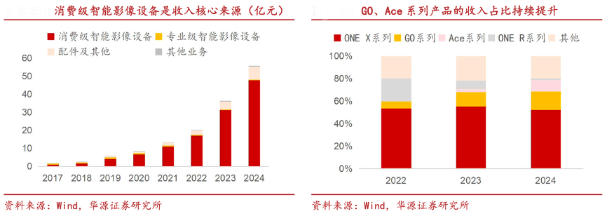 經典案例:根據wind、華源證券研究所等綜合資訊表明,影石從全景相機到運動相機,產品矩陣逐步豐富。2024 年消費級智能影像產品收入達 47.89 億元,同比增長 52.9%,貢獻 85.9%的營收。具體來看,2024 年主力產品 ONE X 系列全景 運動相機占消費級收入的 60.9%。