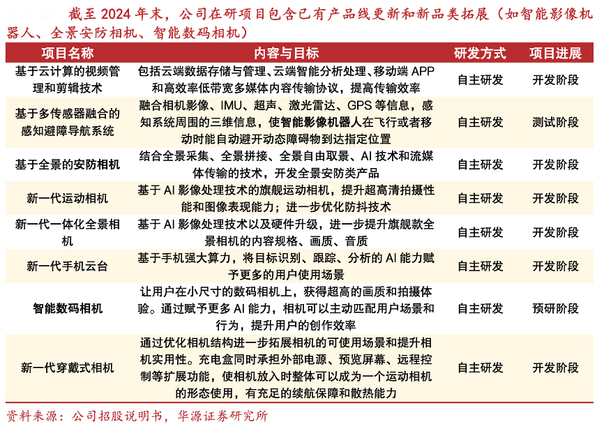 經典案例:根據公司招股說明書、華源證券研究所等綜合資訊表明,目前影石公司在研項目充足,尤其是跨領域技術研發儲備豐富,擁有機械控制技術、機器視覺感知技術和飛行控制技術等儲備。