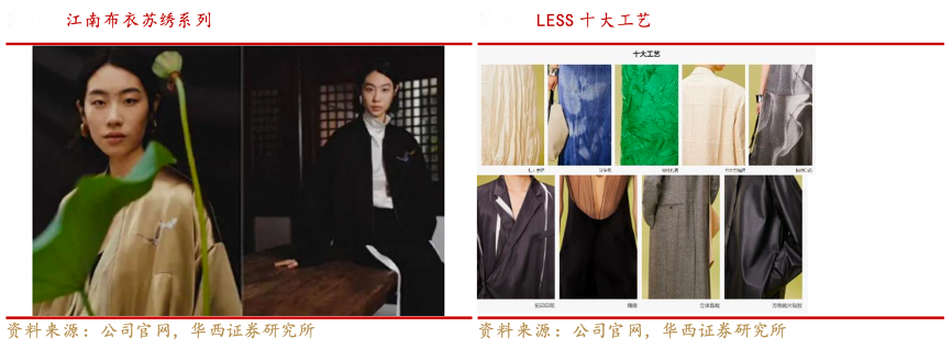 經典案例:根據公司官網、華西證券研究所等綜合資訊表明,江南布衣公司的產品設計不斷汲取傳統文化靈感,在設計上與東方美學相融合,JNBY 23 秋 冬融合國家非物質文化遺產推出蘇繡系列,24 春夏系列融合空申苗寨女 性 傳 統 服飾,將當代審美與中國傳統工藝相結合,彰顯獨特設計風格。