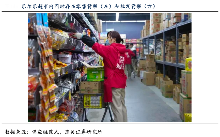 經(jīng)典案例:根據(jù)供應(yīng)鏈范式、東吳證券研究所等綜合資訊表明,樂(lè)爾樂(lè)目前采用批發(fā)和零售結(jié)合的方式運(yùn)營(yíng)。其零售模型服務(wù) C 端客戶(hù),批發(fā)模式服務(wù) B 端客戶(hù)(包括夫妻 老婆店、社區(qū)超市的經(jīng)營(yíng)者)。門(mén)店內(nèi)可以同時(shí)經(jīng)營(yíng)兩種模式,在經(jīng)營(yíng)場(chǎng)地內(nèi)放置兩種貨 架,一種是 3 層的批發(fā)貨架,擺放整箱未拆封的商品,另一種是 7 層的零售貨架,擺放 用于零售的單件商品,兩種貨架上的商品種類(lèi)沒(méi)有差別。C 端客戶(hù)和 B 端客戶(hù)可以在兩 種貨架中挑選并購(gòu)買(mǎi)同樣的商品。