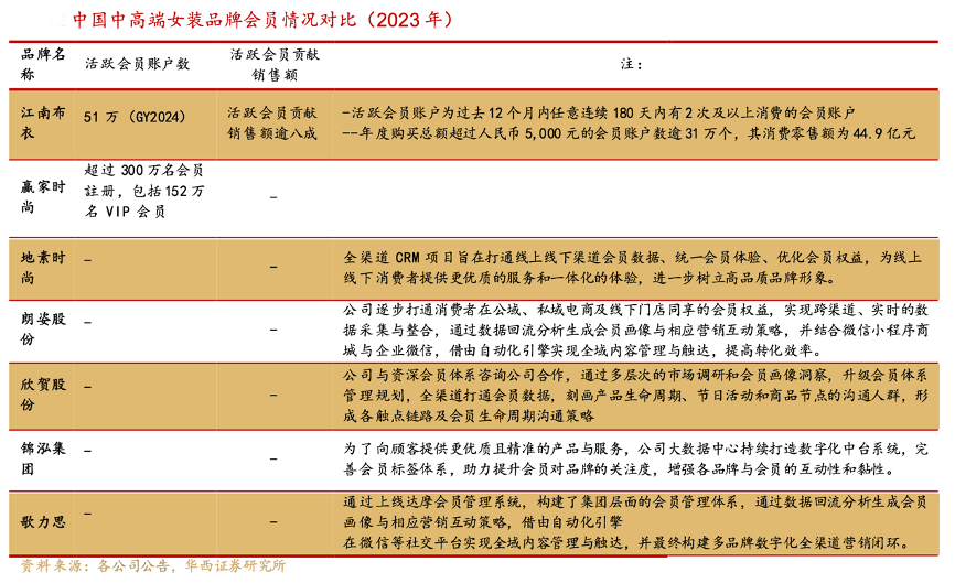 經典案例:根據各公司公告、華西證券研究所等綜合資訊表明,江南布衣公司堅持以數據為驅動、技術為載體、粉絲經濟為核心,持續不斷地為粉絲創造及提供增值服務的場景和觸點建設,用戶粘性強,打造一套“江南布衣粉絲經濟”體系。FY2019-2024H1,公司會員賬 戶數由逾 360 萬增長到逾 740 萬,FY2024 零售額貢獻占比由七成增長至逾八成。