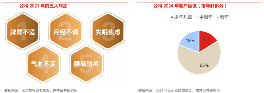 經(jīng)典案例:根據(jù)2024年公司業(yè)績(jī)交流會(huì)、固生堂投資者關(guān)系、東方證券研究所等綜合資訊表明,固生堂公司看診病種以常見(jiàn)病、慢性病和亞健康為主,前五大病種分別為:脾胃不適、月經(jīng)不調(diào)、失眠焦慮、氣血不足和腰肩腿疼,需長(zhǎng)期復(fù)診。從客戶畫(huà)像來(lái)看,用戶以中青年為主,消費(fèi)能力和意愿強(qiáng)。