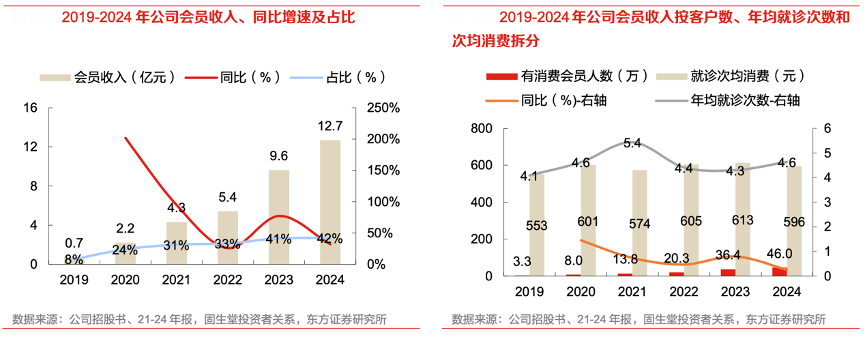 經(jīng)典案例:根據(jù)公司招股書(shū)、21-24年報(bào)、固生堂投資者關(guān)系、東方證券研究所等綜合資訊表明,固生堂以會(huì)員體系開(kāi)拓高頻服務(wù)的增量客戶。公司于 2019 年 3 月推出會(huì)員制度,提供專(zhuān)有服務(wù)、貴細(xì) 藥材和咨詢費(fèi)折扣價(jià)和綠色就診通道,會(huì)員數(shù)量和收入同步快速擴(kuò)大。2019-2024 年會(huì)員收入和 有消費(fèi)會(huì)員數(shù)量 CAGR 分別達(dá)到 76.8%和 69.8%。