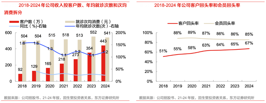 經典案例:根據公司招股書、21-24年報、固生堂投資者關系、東方證券研究所等綜合資訊表明,固生堂客戶數量和認可度不斷提升,客單價有所增加。拆分來看,首先,公司營收快速增長主要得益于年服務客戶數量的增加,2018-2024 年 CAGR 高達 30%;2018-24 年 客戶回頭率從 51%提升至 67%,表明服務能力獲得客戶長期信任。