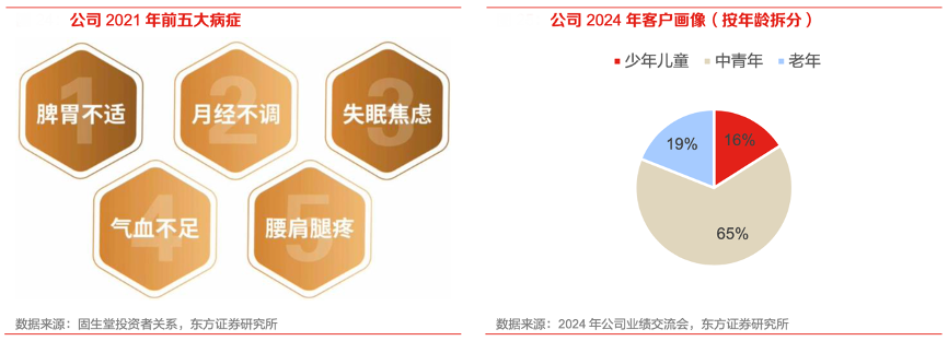 經典案例:根據固生堂投資者關系、2024年公司業績交流會、東方證券研究所等綜合資訊表明,固生堂公司看診病種以常見病、慢性病和亞健康為主,前五大病種分別為:脾胃不適、月經不調、失眠焦慮、氣血不足和腰肩腿疼,需長期復診。從客戶畫像來看,用戶以中青年為主,消費能力和意愿強。因此,公司業務消費屬性突出,收入并不依賴醫保(22 年醫保收入占比僅 28.8%)。
