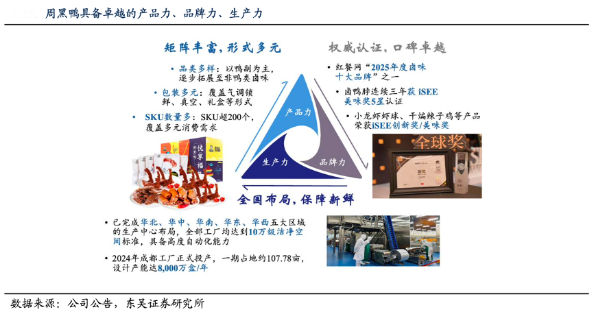經典案例:根據公司公告、東吳證券研究所等綜合資訊表明,周黑鴨具備卓越的產品力、品牌力、生產力。
