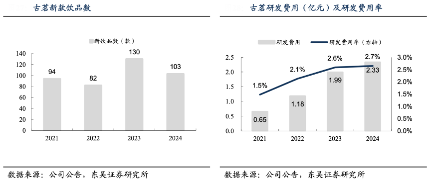 經典案例:根據公司公告、東吳證券研究所等綜合資訊表明,古茗擁有專業的產品研發團隊,其研發平臺依托供應鏈優勢,將受歡迎的新品快速推廣至下沉市場,抓住行業流行趨勢,提高用戶黏性,實現“每天一杯喝不膩”的目標。2021-2023 年的十大暢銷飲品包括同年或上一年推出的 2-3 款新品,2024 年共推出 103 款新品。