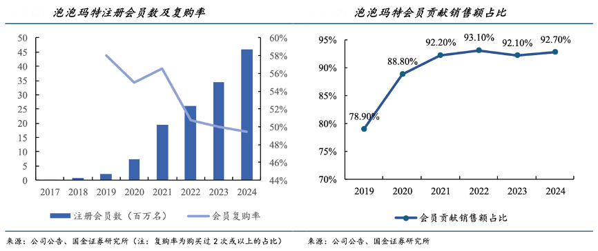 經典案例:根據公司公告、國金證券研究所等綜合資訊表明,泡泡瑪特的核心消費客群為 15-35 歲、 月均消費能力較強,且具有較強社交分享屬性的年輕群體,企業采用分層會員制度并搭建 線上互動平臺,目前,中國內地的平臺注冊會員總量由 2017 年 30 萬人增長至 2024 年 的 4608.3 萬人,會員貢獻當期總銷售額的 92.7%,平均復購率達 49.4%。