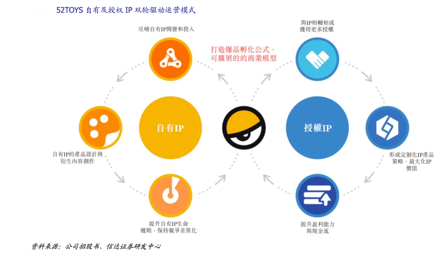 經典案例:根據公司招股書、信達證券研發中心等綜合資訊表明,52TOYS 開創獨 特的“IP 中樞”戰略,通過定制化 IP 產品構建多元化產品矩陣,形成循環,拓展 IP 內容生態,豐富 IP 價值并延長 IP 生命周期。