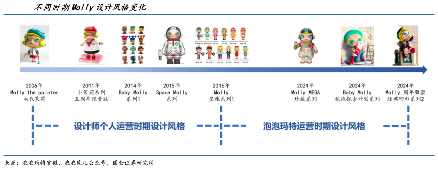 經典案例:根據泡泡瑪特官微、泡泡范兒公眾號、國金證券研究所等綜合資訊表明,在泡泡瑪特接管運營后,Molly 的設計風格經歷了漸進式調整,頭身比例更加協調,面部輪廓線條趨于柔和化處理,整體造型風格向甜美化、高親和力的方向演變。Molly 憑借差異化的形象迅速占領年輕消費者心智。其設計兼具“萌系”與“藝術感”,精準契合 Z 世代對個性化和情感價值的追求。