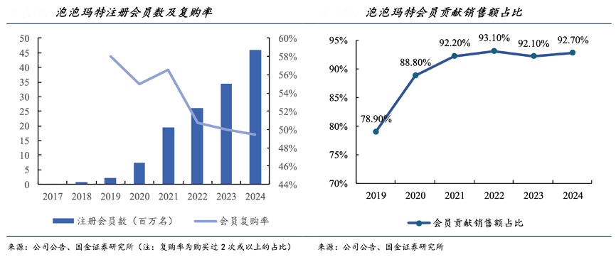 經典案例:根據公司公告、國金證券研究所等綜合資訊表明,泡泡瑪特的核心消費客群為 15-35 歲、月均消費能力較強,且具有較強社交分享屬性的年輕群體,企業采用分層會員制度并搭建線上互動平臺。目前,中國內地的平臺注冊會員總量由 2017 年 30 萬人增長至 2024 年的 4608.3 萬人,會員貢獻當期總銷售額的 92.7%,平均復購率達 49.4%。