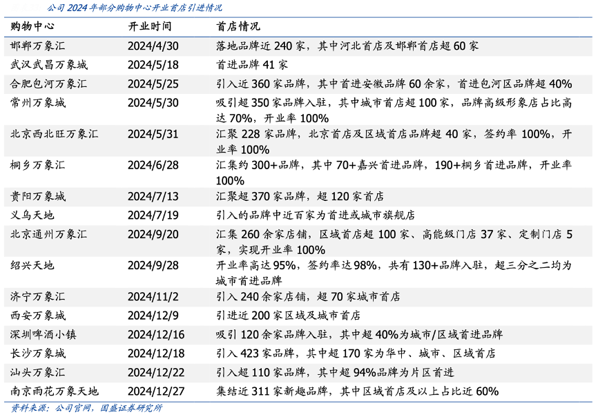 經(jīng)典案例:根據(jù)公司官網(wǎng)、國盛證券研究所等綜合資訊表明,華潤萬象生活多年經(jīng)營積累大量商戶資源打造“首店經(jīng)濟(jì)”,新開業(yè)購物中心開業(yè)率超 90%。其2024年上半年開業(yè)的 7 座購物中心,綜合開業(yè)率均超 90%,首進(jìn)品牌數(shù)量占比超 20%,開業(yè)后成為城市消費(fèi)新地標(biāo)。