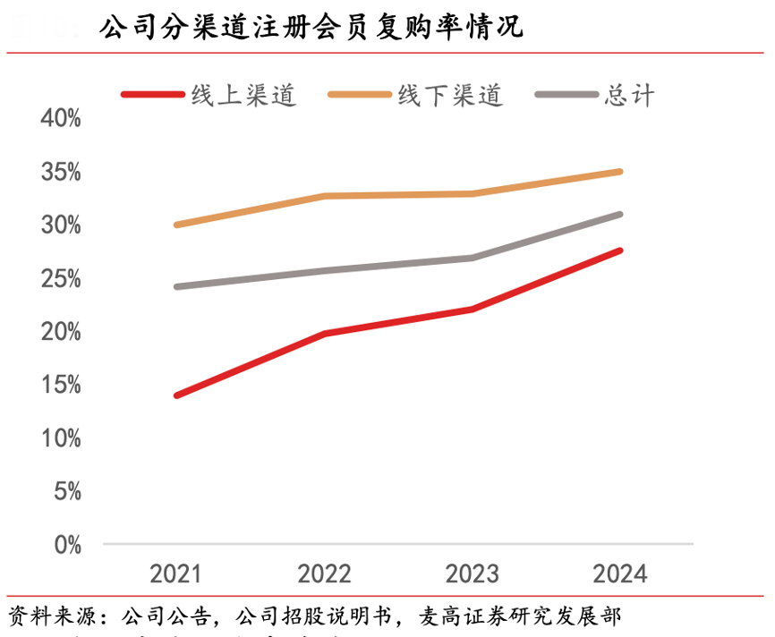 經(jīng)典案例:根據(jù)公司公告、公司招股說明書、麥高證券研究發(fā)展部等綜合資訊表明,毛戈平公司用戶忠誠(chéng)度多年來持續(xù)提升,2024 年線下渠道和線上渠道會(huì)員復(fù)購(gòu)率分別為 34.9%和 27.5%,線下渠道憑借體驗(yàn)優(yōu)勢(shì)復(fù)購(gòu)率較線上渠道高出 7.4pct。
