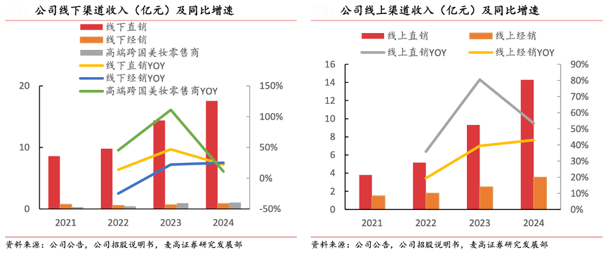 經典案例:根據公司公告、公司招股說明書、麥高證券研究發展部等綜合資訊表明,毛戈平2024年線下渠道、線上渠道收入分別為 19.5 億元和 17.8 億元,分別同比+21.6%和+51.2%,占比分別為 52.2%和 47.8%,線下渠道作為公司基本盤維持兩位數增長,線上渠道收入高速提升。